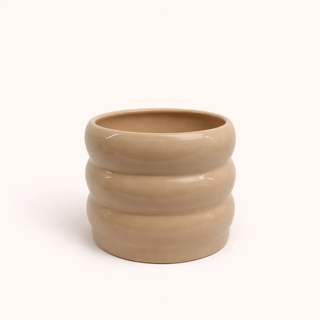 Esta matera de cerámica en tono beige se distingue por su diseño ondulado de líneas suaves y volumétricas, que le aporta carácter y movimiento sin perder elegancia. Su acabado brillante realza el color neutro, convirtiéndola en una pieza decorativa protagonista dentro de estilos modernos, orgánicos o contemporáneos. Es perfecta para plantas ornamentales que se quieran destacar en salas, estudios o espacios bien iluminados.